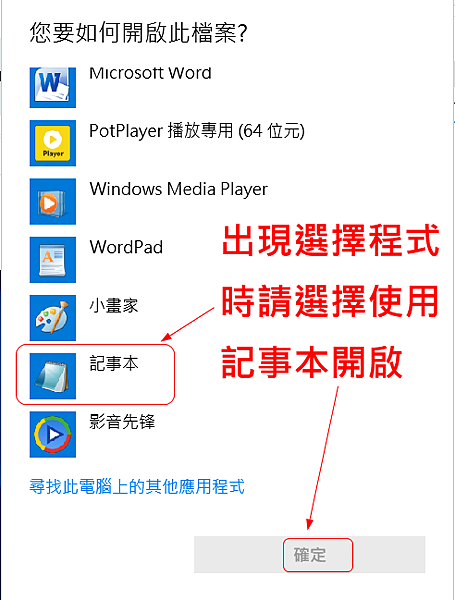 2.當系統詢問您要如何開啟時,請按下以記事本開啟