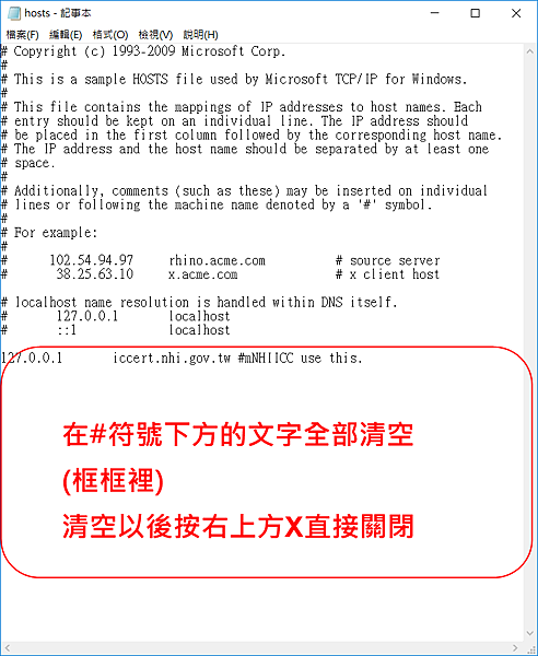 3.正常的hosts檔案應該像下圖的最後一行一樣,如果您發現不一樣,請把圖中最後一行底下的文字全數刪除